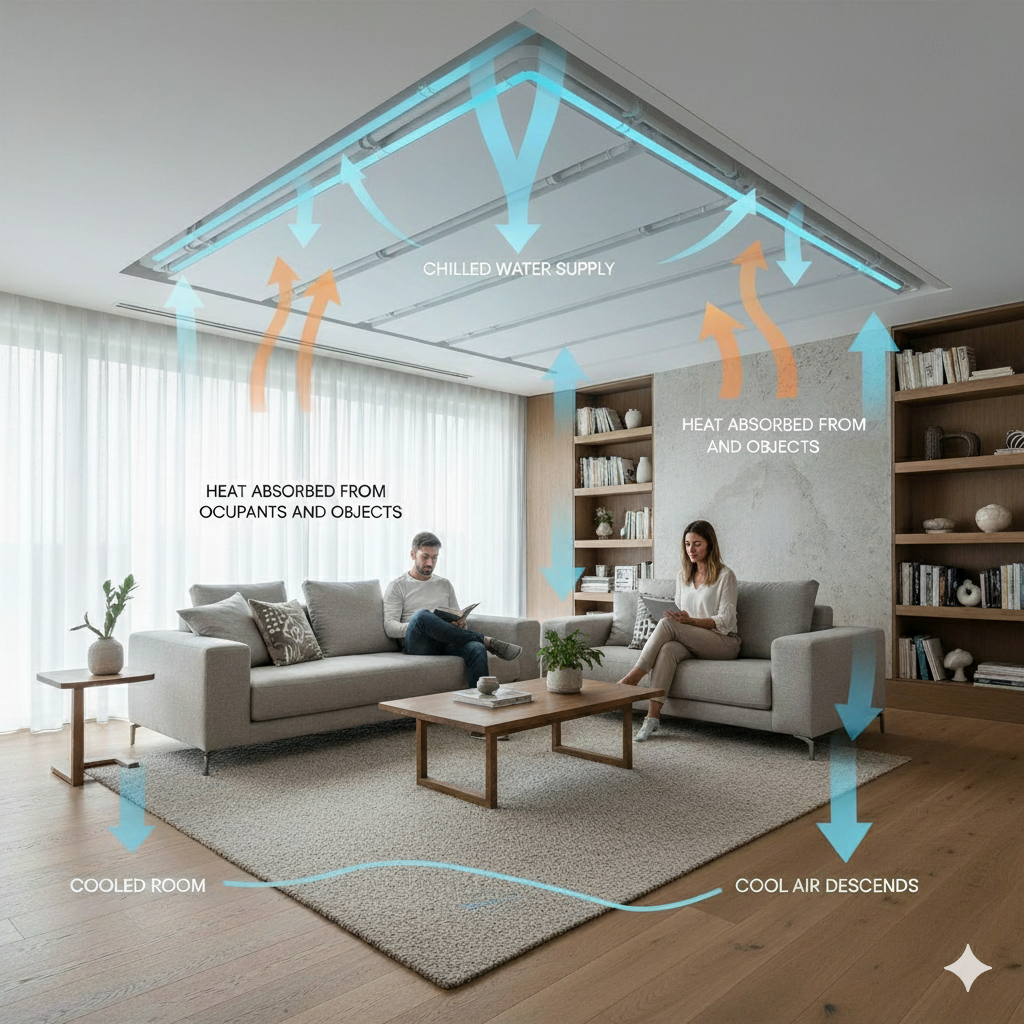 Radiant cooling works by circulating chilled water (typically 16–18 °C) through panels embedded in ceilings, walls, or floors. These panels absorb heat directly from people, equipment, and room surfaces through radiation and natural convection, rather than cooling only the air. Because water is 4,000 times more effective than air at transporting heat, radiant systems can deliver the same cooling effect with far less energy. To manage humidity and fresh air supply, radiant cooling is paired with a Dedicated Outdoor Air System (DOAS), which removes moisture (latent load) and provides clean, dehumidified ventilation.